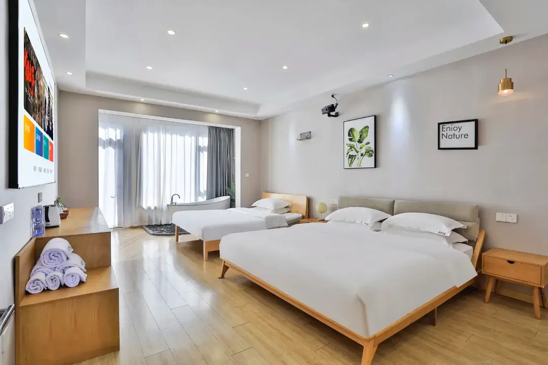 岚舍有多间风格各异的主题房型提供给家人们,每个房间配备独立干湿分离卫生间,日本进口洗发水护发素沐浴露,24小时恒温热水,百兆无线网络,有线电视机。