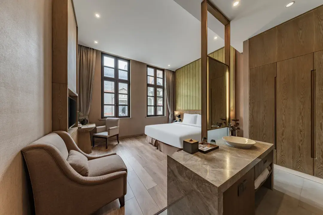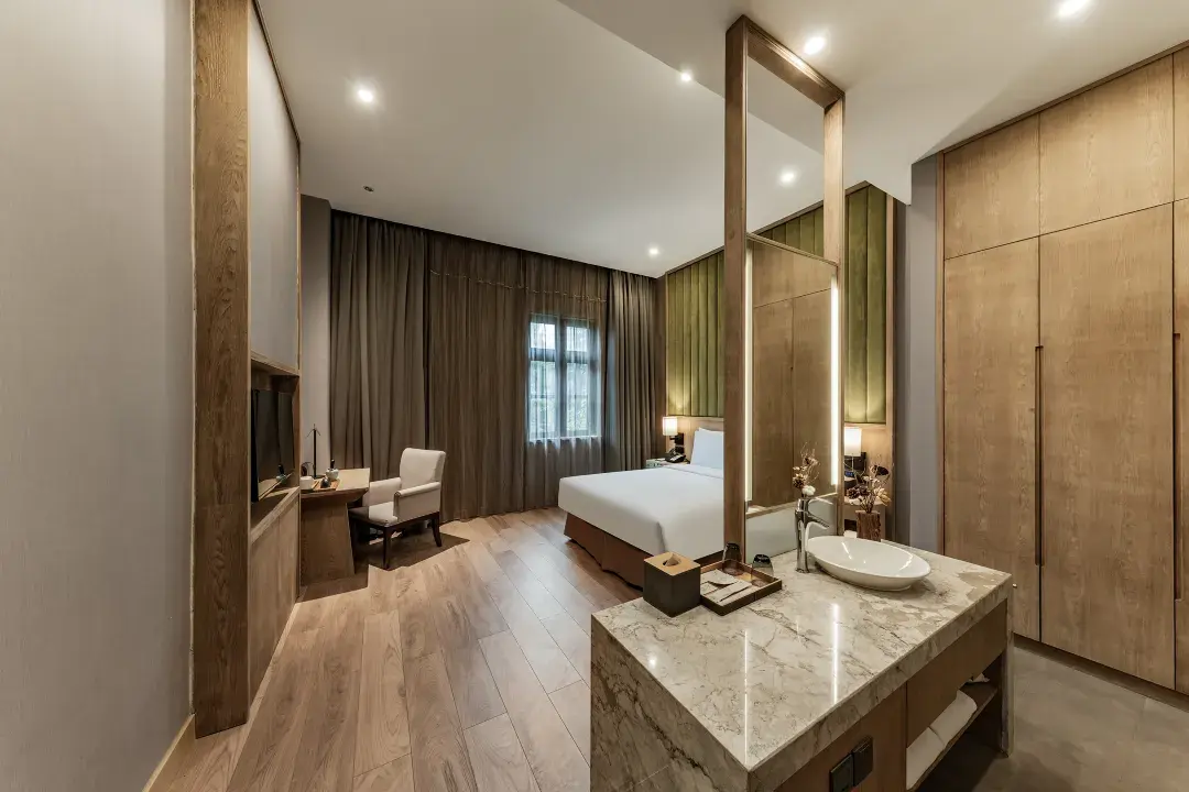 酒店毗邻狼山风景区,距离中南大有境CBD商务区仅8分钟车程,距离南通大学7分钟车程,背靠南通植物园森林氧吧。仿照19世纪初著名的南通南路旧貌原始风格同比例修建,餐饮剧场各类历史痕迹展现,深受摄影行业钟爱。酒店以阅读和属地摄影为主题,高品质的客房产品,温馨细致的服务,带给您“自然、静谧、温暖、朴实”的健康生活方式。客房均采用星级酒店的优质床品、中央空调、全套高端三件套洗浴用品,全WiFi覆盖,全部房型配备冰箱,房间装修低奢素雅。酒店分列街区特色楼栋内,大堂位于城楼脚下,清晨伴有鸟语花香,夜间漫步街区,寻觅独一份宁静。入住酒店本身就是置身特色业态景点,感受专属于那个时代南通传统文化与现代生活方式交互的奇幻感觉...